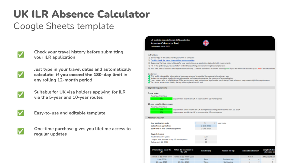 Applying for Indefinite Leave to Remain (ILR) in the UK? Ensure your travel history meets the Home Office absence requirements with this easy-to-use Google Sheets template!